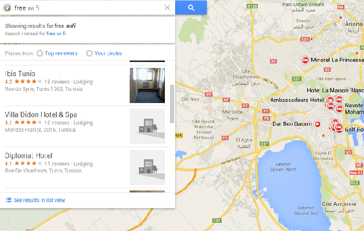 Use Google Maps type in the area you’re visiting, then in the ‘Explore this area. Search nearby’ type in free wifi, and you’ll get a list and locations of places with free wifi available – see above.